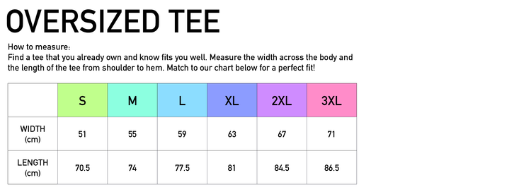 Neck ribbing, oversized fit with dropped shoulders, shoulder to shoulder tape, double needle hems, preshrunk to minimise shrinkage